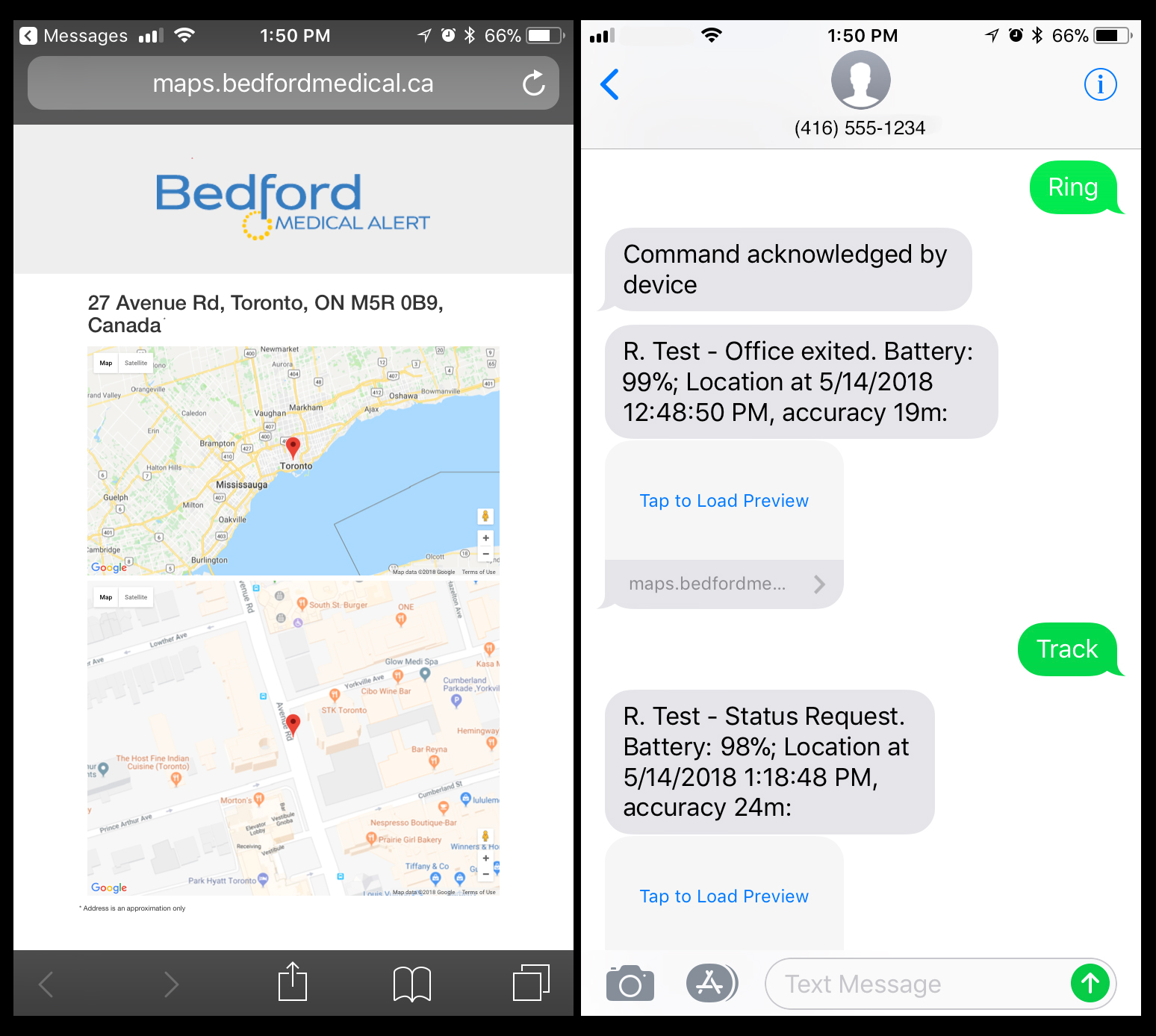 The Base Package, Bedford’s On Demand Location Service, with the Stay Safe allows family members and Caregivers to know the whereabouts of a loved one from a smartphone. By texting the word ‘TRACK’ to a number given to them, family members receive back a map and location. Up to five cell phones and email addresses can receive text alerts relating to battery level, and events such as falls and button pushes,